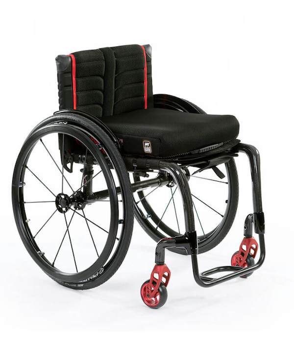 The i-Lite Plus is a modern wheelchair which is both stylish and user friendly. The fold down arms help users get close to table and the black wheels and castors look great against the metallic paint.